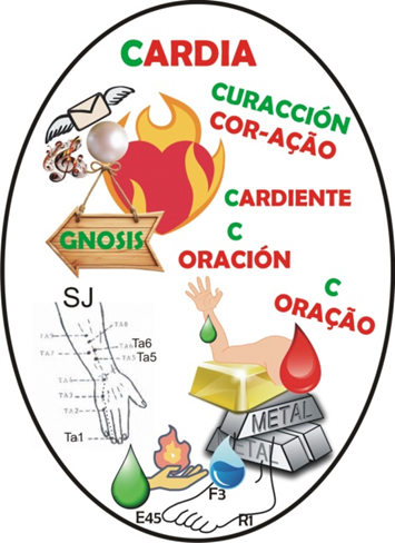 O ato de SELAR A CARTA COM A MÃO DIREITA, de que fala o Hino da Pérola, tem uma profunda implicação com os segredos da Alquimia Gnóstica. Na figura 1, observemos que no DEDO ANELAR da mão direita ali representada surge o meridiano denominado San Jiao, ou Triplo Aquecedor, conforme o denomina a Medicina Tradicional Chinesa e a Alquimia Taoista. Esse meridiano comanda o éter químico no âmbito do peito, fazendo o seu poder atuar no coração e no estômago. Dois dos seus pontos principais, o TA5 (Wai Guan) e o TA6 (Zhigou), são relacionados com o aquecimento digestivo e à MODULAÇÃO DA VOZ, funções que alquimicamente transformadas dão origem ao poder gnóstico que permite o CÂNTICO SAGRADO e a Nutrição Espiritual, a Santa Eucaristia.