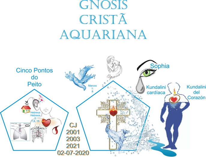 | Figura 3. A Via Iniciática gnóstica como via da Kundalini Cardíaca. No alto vemos a Pomba do Paracleto, o Aguadeiro, ou Urano-Aquário, e Pistis Sophia suplicando chorosa por socorro da Luz. Por orientação de Pistis Sophia o gnóstico deve ir ao Jordão se batizar e acender o fogo kundalínico cardíaco. Assim, o Cristo fundido no madeiro da Cruz formará com ele um par cardíaco que colocará em operação o pentágono dos cinco pontos do peito (mostrado à esquerda da figura). A gota e o coração abrirão a audição instrutiva que vem da Casa Santa, atendendo assim à súplica de quem aspira e suspira por libertação. |