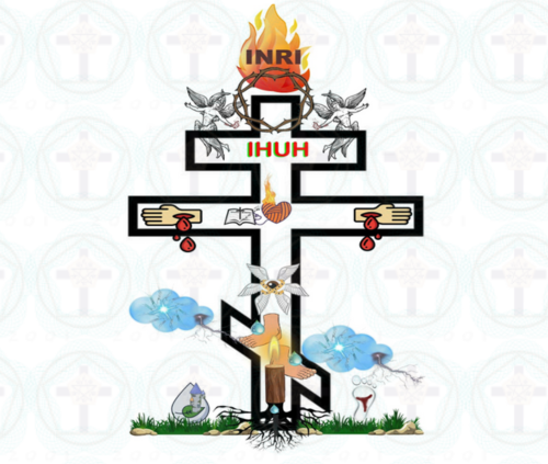 A figura da cruz, por conseguinte, agrupa ao seu redor um conjunto de muitos símbolos: a madeira; o verde; o fogo atiçado no alto da Cruz pelos Anjos do Fogo Renovador (INRI); o título Meller, que nomeia Jesus como Rei; a palavra grega ton- τῶν, escrita com a letra tau-τ; a palavra yazd significando “Anjos que pastoreiam ovelhas na relva verde”; o Arcanjo Ameretat, regente da vida verdejante na Terra, em especial a dos pinheiros e a das palmeiras; e as Tradições Sagradas dos yazidis, que nos levam à Babilônia antiga do deus Tas Mikigal, regente da agricultura.