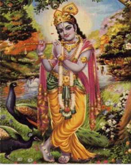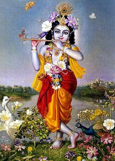 O deus hindu Krishna é representado nos Vedas Sagrados como um homem de pele azul que passeia por belos bosques com lagos, tocando flauta e em companhia de pavões (figura 5).