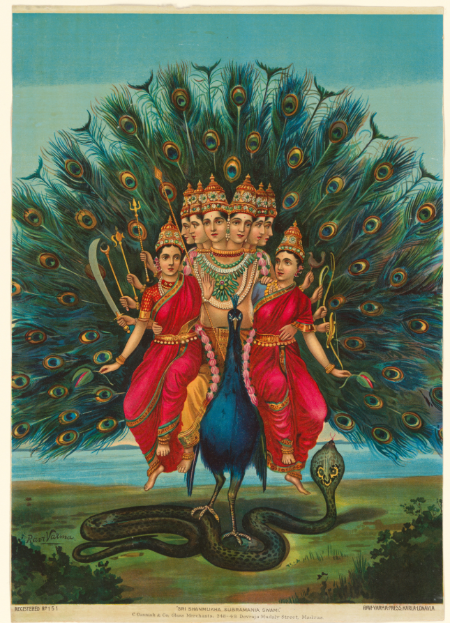 O pavão real é considerado uma criatura divina na mitologia da Índia, especialmente como veículo (vahana) de Kartikeya, filho de Shiva (figura 6). Shiva é o poderoso deus do tridente das águas e comandante-em-chefe dos exércitos de todos os deuses. Também se diz que, em certa ocasião, quando os deuses tomaram a forma de diferentes pássaros, Devraj Indra (o deus da chuva) escolheu a forma do mais refinado deles, o pavão real. Desde então, quando o Senhor Indra envia chuva à terra, todos os pavões reais dançam em expressão de júbilo, uma visão digna dos deuses, segundo as mentes religiosas hindus.