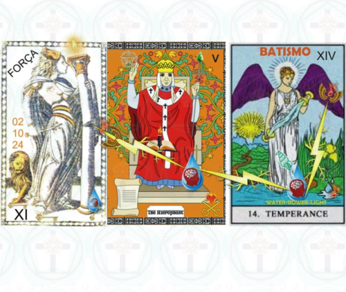 Figura 1: A Carta do Hierofante ou Carta 5 (V), a Carta da Força (XI) e a Carta do Mistério Batismal (XIV). A Força Water-Power-Light.